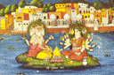 インドの神様絵はまったく同じ構図で描かれたものが氾濫しているので、オリジナルがどれなのかよくわからない事態に陥っている。