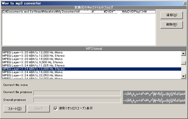 「mp3」ボタンは、以下の画面が開き、上記指定フォルダ内のWavファイルをmp3形式へ変換できます。