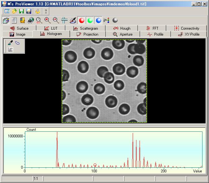 ヒストグラムツールは、全ての画像において各色255段階(8bit階調)にマップされます。ヒストグラムは選択領域 |