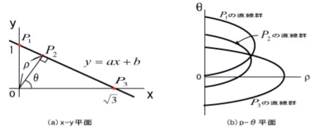 | ハフ変換は、画像内の単純な形状を検出するための方法の1つです。 ハフ変換は直線ばかりでなく,円や楕円にも適用されている手法で、検出したい線の種類が方程式の形で表現できる場合に有効な方法です。 以下のようなx-y座標系における一つの直線を考えます。 ![]() この直線に原点から垂線を下ろし、その長さをr,x軸とのなす角をThetaとすれば、 この原理を利用して与えられた画像から直線を検出することができます。すなわち、画像中のn個の点に対してr,theta平面上ではn個の曲線が描かれ、このうちm個の曲線が1点で交わっていれば、このm個の曲線に対応する現画像上のm個の点は同一直線上にあるということになります。 ハフ変換の特徴は,画像中の直線が途中で切断されている場合や、雑音が存在する場合でも比較的良好な結果を得ることができる点にあります。 ハフ変換には、 以下のオプションが選択可能です。 Algorithm group : Thresholds group: Accumulator group: |