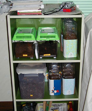 5月26日に最後の1頭が蛹化したんですが、その後、子供が遊んでいてカブトムシが置いてあるカラーボックスを蹴っ飛ばすという事件がありまして・・・カブト蛹は無事だったかな?・・・やはり子供部屋は置き場所としては不適切だろうということで、蛹の入ったケースとペットボトルを全部、私の仕事部屋の温室の中に移動させました。