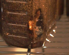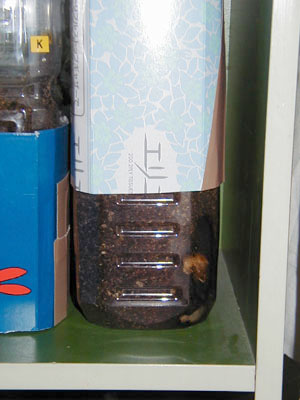 私は、もしかしたらペットボトルの底の形状が理由のひとつではないかと考えています。私が使っているペットボトルの底は中央が盛り上がっていて、平らな部分は四隅に限られています。もし底がまっ平らだったら、ペットボトルでも見えないところに蛹室を作ることがあるのではないだろうか・・・と。それを確かめるには、何か硬くて幼虫に害にならないものをボトルの底に敷かなくてはなりませんが、それを考えているうちに蛹室を作られてしまって、今回はできなくなってしまいました。