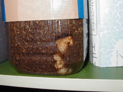さて、おーぬま式ペットボトルの作り方の説明の最後に「ほとんど水を追加する必要がありません。」と書きましたが、私は幼虫が蛹室を作ってから羽化するまでの間、マットには全然水分を補給しませんでした。近所の子供の話ですが、飼っていたカブトムシの蛹が、毎日霧吹きをかけていたら死んだと聞きました。以前Web上のどこかで似たような話を読んだような記憶もあります。また、3月蛹化の6頭のうち1頭、マットの上であばれてなかなか蛹室を作ってくれなかったのがいたのですが、やや水分控えめのマットに交換したところ蛹室を作り始めたということもありました。もしかしたら水分過多は蛹化や羽化の妨げになるのかもしれません。クワガタ飼育の解説書では、蛹室内に結露したり水がたまると羽化不全を起こしやすいという説明が書かれていますが、それと同じようにカブトムシの蛹も水分が多すぎる状況は嫌われるのではないでしょうか。もっともカラカラに乾いてしまうのも問題でしょうが・・・。