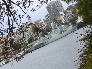 写真はオーストラリア海軍の港のある湾です。真ん中の倉庫のような細長い建物は倉庫を利用したアパートになっています。一番先端の家には有名な人が住んでいるらしい。