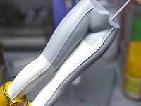 すみれの教訓から、サフを吹き直すことにしました。ヒザから下はズボンの色を塗ってあるのでマスキングしています。