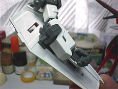 代わりに先に組み立てた持ち手の着いたビームライフルを取り付けます。
