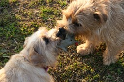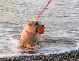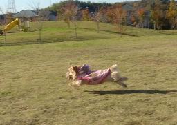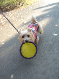 | フリスビーにも挑戦。だけどまだくわえて歩くだけなの。 |