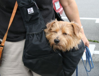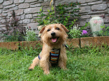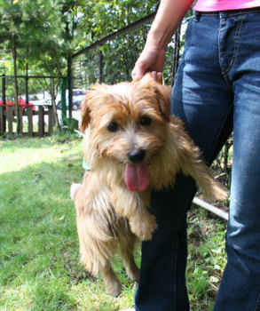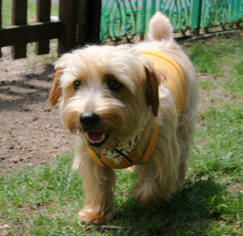 やんちゃという意味が名前の由来のノーティ君 ハーネスで持ち上げられることしばしば。でもとってもフレンドリー。 クインシーにそっくりの顔です。 |