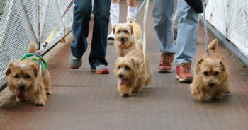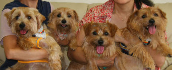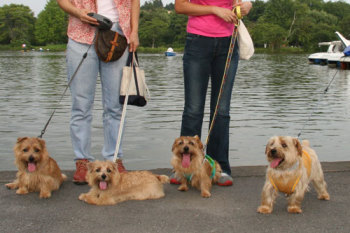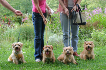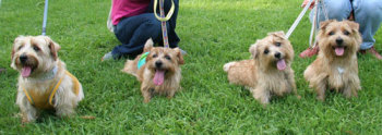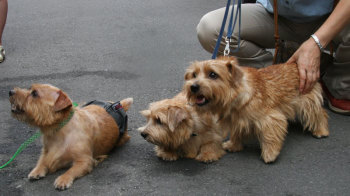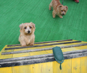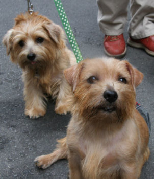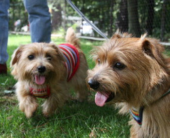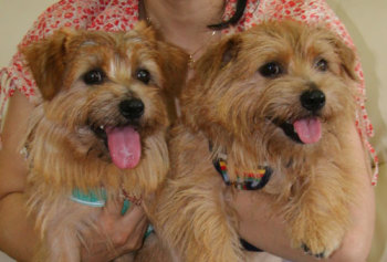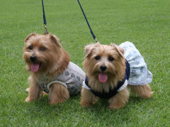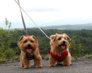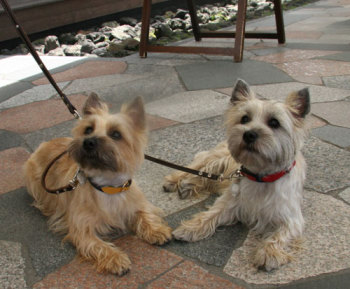 軽井沢プリンスショッピングプラザでお友達になったケアンテリアのオードリーちゃん(左)とメイブルちゃん(右)。とても美人さんの2頭でした。 |