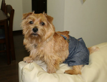 部屋の中でマーキングしちゃうので、デニムショーツ型のマナーパンツを装着。 |
