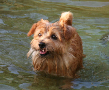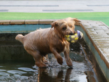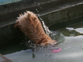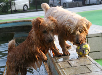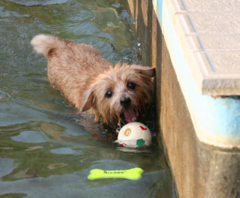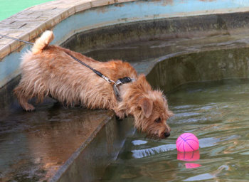 僕はプールには入りたくないんだ。でもボールは欲しい。クィンシーは意外に気が小さい。 |