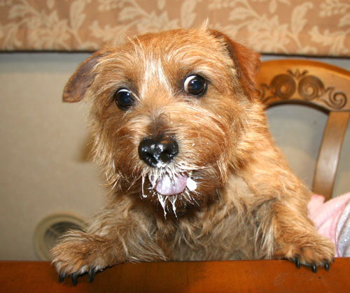 おいしかったよね。 髭と鼻にクリームがついているよ。 |