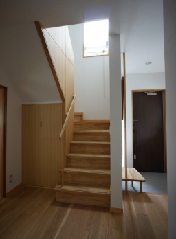 2階の廊下 階段を上がった2階の廊下は暗くなりがちなので、階段踊り場の窓を縦長の窓とし、トップライトを設けて、明るい空間となりました。