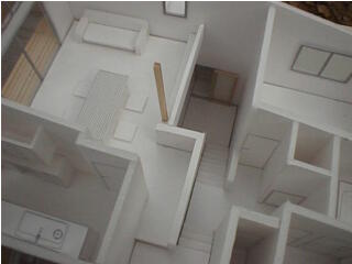 インテリアは、ほぼワンルームで、床が三つのレベルにスキップしている。ちょっと複雑なので、模型にしてみると解りやすい。