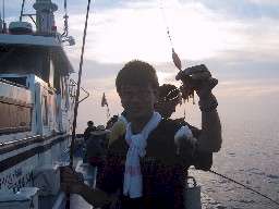 ユメカサゴ(1)25cm バラムツ(1)120cm、15kg 沖の潮が速いらしいという情報を得ていたので遠走りせずにタカ(近場)のキワ(房総半島の岸寄り)から攻めてオキオキに(南下して)行こうということになりました。第一投目ウワバタの350mラインに落としたのですが、いとうちゃんにドンコ、まるかつにノドグロ(ユメカサゴ)が来ました。トックンは「アタリがあったもののハリ掛りしなかった。」という説明で空振りでした。そこでいとうちゃんのドンコを見て「小せえなぁ。」と一言。ご存知の通りトックンはドンコが大好物でつい、いとうちゃんのドンコが羨ましくなりからかった一言を言ってしまったのです。これが後から分かるのですが「ドンコの復讐」を招いてしまいました。次の投入は「もしかしたらメヌケが出るかも、出ればでかいぞ。」と言うことで600mダチに落としました。底ダチをとってアタリを待っていると、突然まるかつの竿先がまっすぐになってしまいました。慌ててリールを巻くと何の手ごたえもありません。注意して巻き上げると300mで道糸がスッパリ。たぶんタチモドキの仕業でしょう。絡み防止リング、水中ライト、仕掛け、オモリ全てを一瞬にして大ショックですが、気を取り直して予備道糸100mを結び再開準備を整えました。次は少し沖へ出て400mラインを狙いましたが、底立ち後、いとうちゃんに強烈なアタリ、しかしすぐに仕掛けが切られてしまいジ・エンド。 |
