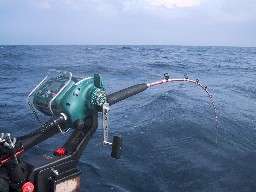 出だしはジギングからスタート、70mダチですが途中止めながら下しても90m近くラインが出てゆきます。100号オモリのエサ釣りの人たちの道糸もかなり斜めに入っているのですが、ミヨシで一人だけジギングのまるかつは迷惑をかけないように気を遣いながらの投入となりました。しかし、底ダチを取って10mシャクリ上げると直ぐにバイト。エサ釣りにアタリが出ない中注目を浴びて巻き上げるのは快感です。隣のオジサンも「ルアーの方が食いが良いのですかねぇ。」と話し掛けてくる中、2投目は底から30mで強烈な締め込みが来ました。これが今日一番のメートルサイズで「今日は何本釣れるやら?」と心配になりましたが世の中そう旨くはいかず、潮がどんどん速くなる中90mダチに移動するともうジギングでは釣り不可能な状態になってしまいました。そこでルアーで4本釣ったので満足しエサ釣りにチェンジしました。今日は1本バリ2.5mで柔らかめの竿で止めずにシャクリ上げる釣法で勝負する事にしました。エサ釣りでほとんど釣れていない中ルアーに反応が良かったのがヒントとなり作戦成功です。船中1〜5本がほとんどでしたが、食わせる釣りで満足な結果になりました。 |