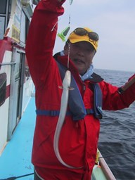 オモリが大きく跳ね上がらないようにしながらオモリと仕掛けが海底でコトコト動くようなイメージで左右交互に10〜20回小突き、そっと聞き上げます。ここでアタリやモタレを感じたらアワセるのですが、アナゴの口は堅いのでしっかりとハリ先を貫くような気持でしっかりアワセます。