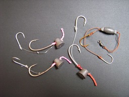 内房では、8号の中オモリにハリス4号5ヒロ(7.5m)、豆テンヤ2号の組み合わせが標準。大原では30号の鋳込み天びんにハリス5号6m、豆テンヤ2号の組み合わせである。