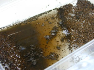 ・先ず、タッパーなどの容器を用いて、水でお米を磨ぐように水に濁りが無くなるまでバラストを洗ってしまいます。(下の写真)