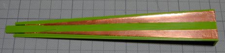 最近では裏に粘着性のある銅テープを用いたものを使っています。銅テープは、以前は一般では入手が困難でしたが、近ごろは園芸店でナメクジよけ等として入手できます(植木鉢の周囲にぐるりと貼るとナメクジが登ってこれないんですねぇ)。その後、大手の100円ショップ等でも「銅箔テープ」を見つけ、おどろきました。