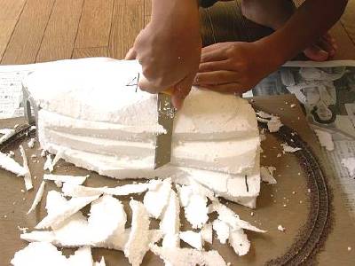 発泡スチロールをカッターナイフで削って、大まかに成形。