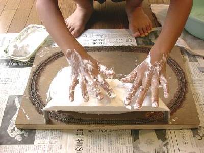 水を加えて柔らかくした紙粘土に木工ボンドを混ぜたものを使って、山の形を整えていきます。