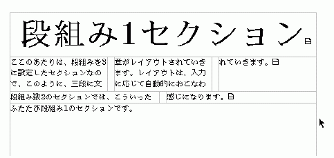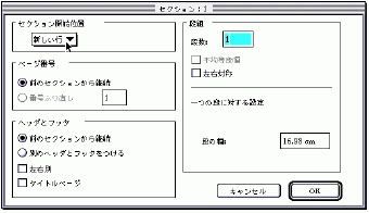 同一ページ内に複数の段組みを混在させる場合、まず、書式メニューの「セクション設定」を開き、セクション開始位置を「新しい行」に設定します。