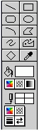 をクリックすると、左側にツールパレットが表示されます。ここには、作画用のツールがならんでいます。これらのツールをもちいてワープロ画面上で作画すると、自動的にドローデータとして文書に画像が設置されます。ツールには、直線、四角、円、自由曲線等があり、それぞれ、色やパターン、線の太さ等を自由にかえられます。