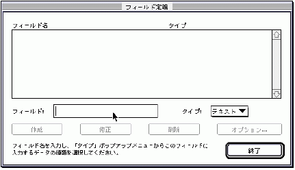 次に表示される画面はフィールド定義のためのものです。フィールドとは、データベースに登録する項目のことです。つまり、どのような項目を持つデータベースを作成するのかをここで決めるということになります。