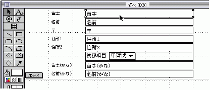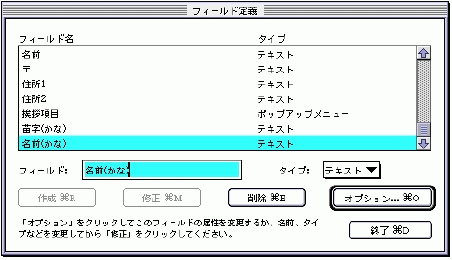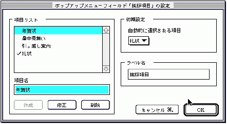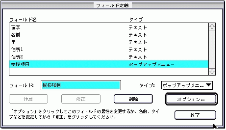 ここでは、住所録で基本的に用いられる項目だけを設定しています。タイプは、その項目の内容を示します。テキストは文字の内容が入る場合、ポップアップメニューは、はじめから登録してあるいくつかの中から内容を選択する場合です。ここでは、挨拶項目というフィールドがこれになっています。