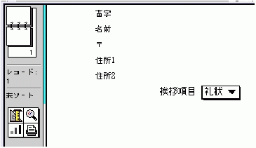 データベースの印刷は、印刷用にレイアウトを作成し、用紙を設定して行います。葉書に印刷する場合は、手持ちのプリンタが葉書印刷に対応していることを確認してください。また、表示メニューからページビュー、定規表示を選択しておくと作業が楽になります。以下は、はがきサイズ、ページビュー、定規表示の状態の画面です。