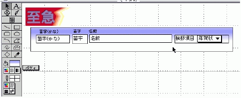 例の中の「至急」はライブラリから、また、背景のグラデーションは、最背面に設置したペイント領域をぬりつぶしたものです。これを入力画面から見るとこうなります。