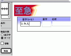 検索は、クラリスワークスの場合、驚くほど簡単です。レイアウトメニューから「検索」を選択し、表示されるフィールドに検索したいキーワードを入力し、左下の検索ボタンを押すだけです。完全に単語として検索語が一致しなくても、部分として一致していれば検索結果として表示されます。