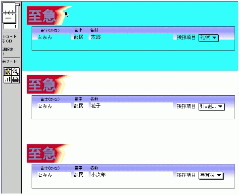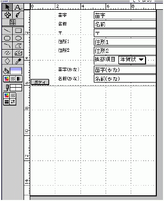 ここでは、ペイント、ドローを使って、項目のうち、苗字、苗字(かな)、名前、挨拶項目だけを一列にレイアウトした新規レイアウトをつくってみました。