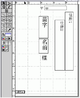 このままでは、葉書の宛て名になりませんから、項目名の不要なものを削除したり、位置やサイズを変更したり、ボディ位置(1データの領域)を設定したりしてゆきます。ここでも基本はドローの編集作業です。住所、名前等、縦書きにしたい場合は、その項目を選択してから書式メニューから縦書きテキストを選択します。