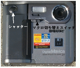 この講習では、SONY社のデジタルカメラ、DigitalMavika MVC-FD51を使用します。この機種の最大の特徴は、画像の保存にメモリではなくフロッピーディスクを使用していることです。つまり、ユーザーは複数のフロッピーを携帯していれば、そこにどんどん撮影データを保存していけるわけです。一枚のフロッピーには標準画像形式で30〜40枚、高画質形式でも15〜20枚の画像を保存できます。普通のフィルム一本分の写真がフロッピー一枚におさまる、と考えればよいでしょう。