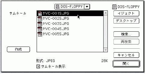 ファイルを開くウィンドウが表示されますから、ここで撮影したフロッピーをマッキントッシュに挿入します。ウィンドウには、そのフロッピーに保存されている画像ファイルの一覧表が表示されます。ファイルには撮影した順番に通し番号がつけられています。画像はJPEG形式なので、JPGという拡張子もついています。