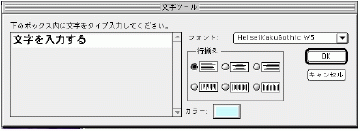 Tアイコンをクリックすると、次のような文字入力ウィンドウが開きます。この左側のボックスに入力した文字を写真の上に重ねて配置できます。