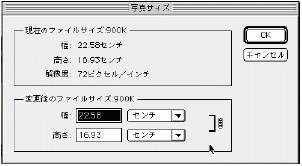 サイズは、画像全体のサイズを拡大・縮小できます。これを選択すると、次のようなウィンドウがひらきます。画像のサイズをセンチメートルで指定できます。単位の部分ピクセルに変更して、ピクセル数でリサイズすることもできます。