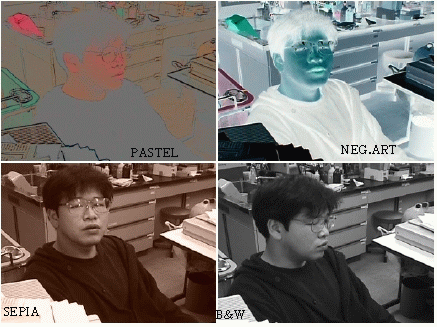背面の特殊効果切り替えスイッチを押すと、四種類の特殊効果を撮影する画像に加えることが出来ます。PSTEL(パステル調)、NEG.ART(ネガフィルム調)、SEPIA(セピア色)、B&W(白黒)の四種類で、効果は押すたびごとに切り替わります。