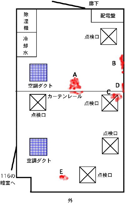 115室の略式天井伏を示す。赤で示された各箇所にしみやかびが観察されている。 それぞれの箇所をクリックすると、そこの状況が表示される。