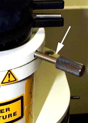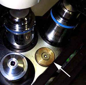 対物レンズレボルバーの軸も錆びた(矢印) レボルバー部分は顕微鏡のパーツの中でも特に精度と強度を必要とする重要部分であるがご覧のとおりである。 |