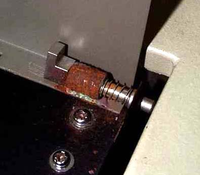 SEMのパネル蝶番部分 SEMの修理の際に発見された。反対側の蝶番も同様にさびていたが、そちらは一応分解の上錆び落としができた。こちら側は、それすらもできず、完全に中まで錆びてしまっている。SEMの説明書には、設置環境として、湿度は60%をこえないこと、とある。管理上、日常的な湿度が70%を超えるこの部屋が設置にふさわしくないことは明白である。 |