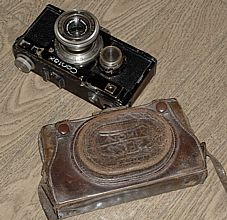 しかも、各部をみているとどうもいろいろとよせあつめされているっぽい。シリアルはボディと裏ぶたで一致しているんだけれど、ボディ前面の皮は張り替えてあるし、シャッタースピード指示の矢印もない。アクセサリシューは旧型のネジなしだし、脚はむく。距離ファインダーは内側、という具合。皮ケースがついてきたのはラッキーだった。レンズは沈胴テッサーで、これでためし撮りするのも楽しみ。