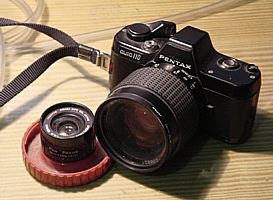 これは、僕ではなくて弟が買ったカメラ。当時はミノルタも110の一眼レフを出したり、とこういうのが結構あった。ペンタックスは6×7なんかも出しているせいか、こういうシステムのをつくったのかも(ということは、これの祖先はペンタコン6かな?)。110のフイルムはまだ入手できるので、時折持ち歩いている。レンズは20-40のズームとパンフォーカス18mm。どうも、サービスに焼くと粒子があらいような気もする。でも、一眼レフだから、パンフォーカスレンズの前に虫めがねをくっつけて接写してあそんだりもできるのが楽しいし、なによりも「小さい」のがうれしい。ASA400の切り欠きが最近のKODAKのフイルムにはないのがちょっと不便。ニッパで削って使ってます。