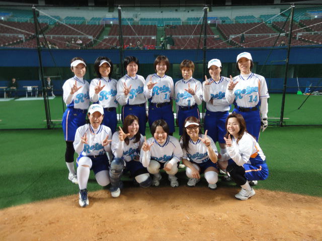 | ■練習試合《4/20(土)》ナゴヤドーム なんと!あのナゴヤドームで練習試合をさせていただきました! 4/20-21と一部リーグの開幕戦がナゴヤドーム開催されたのですが、その試合の終了後、名古屋所属のレディースチームが集まって練習試合をさせていただくことができました。 1部リーグの第三試合が開始したら、外野の空きスペースでウォーミングアップ。 みんな、聖地ナゴヤドームのグランド上で大興奮!人工芝の感触、フェンスの硬さ、すべてのことに感激です! ![]() まずは基本のキャッチボール つづいてトスバッティング 今シーズンから仲間入りの松本(左) 準備体操、キャッチボール、トスバッティング、ティーバッティング、プチフリーバッティング、ノックと、きっちりウォーミングアップをこなし、1部リーグの試合が終わるのを待ちます。そしてついにベンチイン! ![]() 一部リーグの試合が終わるのを待ちます ベンチイン! 試合開始に向けて準備です 試合前のシートノック。イレギュラーの無い人工芝。意外と固いホームの土。いろんな頃を体で確かめます! ![]() 本日スタベン真代ちゃんが捕球係 シートノックはいつもの愛ちゃん 恒例の「レテンの”レ”」でいざ出陣! さー!試合開始です!対戦相手は、同じ名古屋に所属するレディースチーム「ベアーズ」。試合時間は1時間。レテン先行で始まります。プレイボーーール!! いきなり松田出塁!松本も出塁!そして投げて打つ3番打者もーちゃんがランナーをためた状態で左中間を切り裂くクリーンヒットで先制点!モーちゃんナイスバッティング!!!1回表に3点先取。とてもいい流れです。エンドランのサインなども出し、いろいろと試すこともできました! 1塁松田、バッターボックス松本 ゆい松田ホームイン♪ 4番リーダーも狙ってます! ネクストにもーちゃん ![]() バッターキャップ。ネクスト谷ちゃん サードランナー三塁打のモーちゃん 今回はスコアラーで活躍の真代ちゃん ランコーゆってぃーも声が出てます! 今日の先発はモーちゃん。今日もよろしくです!バックもいい緊張感。みんな声も出てました! ![]() ピッチャー モーちゃん! キャッチャー ゆい松田! ![]() サード リーダー! ファースト 松本! ![]() ショート もっさん! センター キャップ土方!! レフト ゆってぃー! (セカンド恵子さんと、ライト谷ちゃんは遠くて撮影できず。ごめんなさい) 2回表も打線が好調。そして、いろいろなサインプレーもためし、愛ちゃんの采配的中! ![]() もっさん 安定感のある送りバント ゆってぃー 気合十分です! スコアラー 真代と監督 愛 そして、ピッチャー交代!守備位置も変更し、これまたいろんなパターンを試すことができました。 ![]() ピッチャー 恵子 リーダーはセカンド(ライトに谷ちゃん) サードに移動してきた松本(センターにキャップ) 満塁のピンチがあったもの、しっかり守りきり1時間経過、楽しい時間があっという間に過ぎてしまった。今日の試合は、いろんな収穫があり、これを生かして全レの予選に挑んでいきたいと思います! ■試合結果(1時間で試合ストップ)