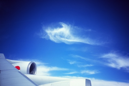 千歳から羽田へと向かう旅客機の窓からみた巻雲。旅客機の窓から見る雲は白く輝き、そして空はどこまでも蒼く美しいのです。