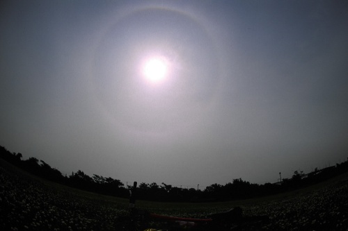 主にゴミや残土を埋め立てて造成された、東京都江東区若洲。そこにある公園で出会った内暈です。対角線方向で180度の画角をもつ魚眼レンズで、空をまるごと写し込みました。広々とした埋立地は障害物もなく、空の観測・撮影に適していると思います。