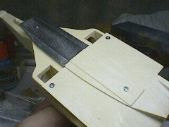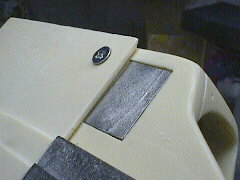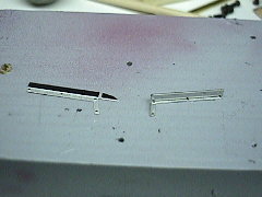 ガーニーフラップフロントウイングのフラップに付くガーニーフラップはエッチングパーツを折り曲げて作ります。小さくて細長い金属の板をどのように加工すればよいのかしばし悩みました(写真左の板を右のように加工します)。 |