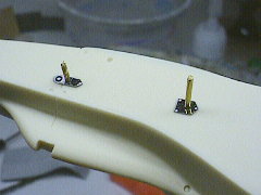 サスアームの基部サスペンションアームの付け根がエッチングパーツになっていました。瞬間接着剤でキャスト地に接着しています。固まるまで位置がズレないように真鍮線を刺しておきました。